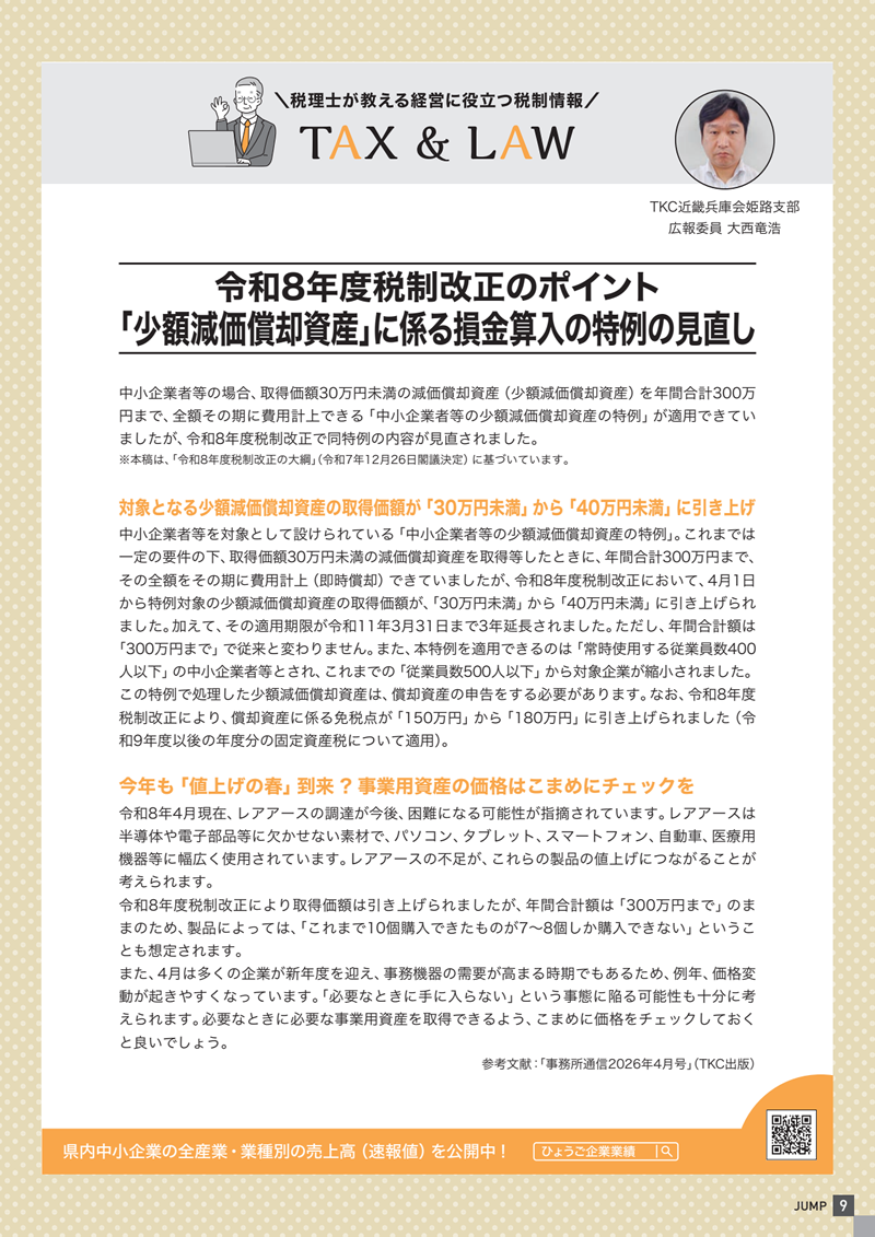 令和8年度税制改正のポイント「少額減価償却資産」に係る損金算入の特例の見直し