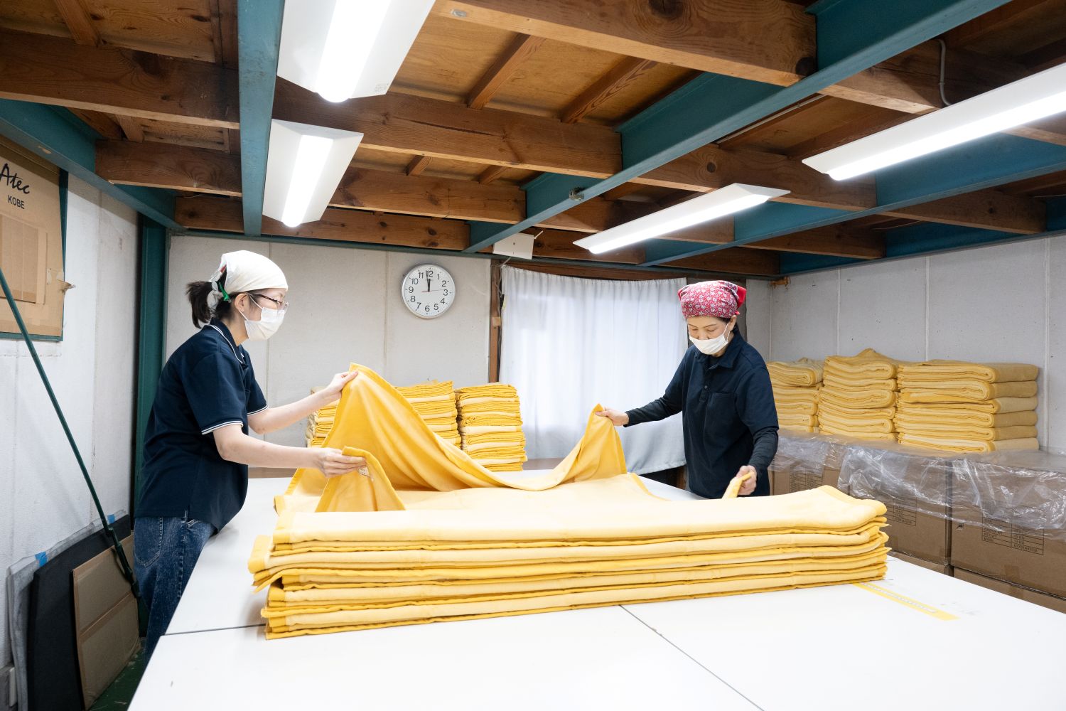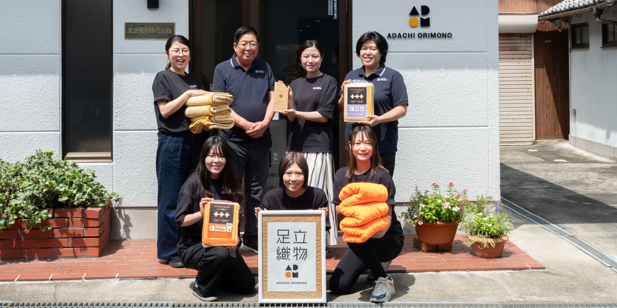同社は1950年に播州織の産地、多可町で創業。「お客様の声をカタチに」をモットーに紡いできた75年の歴史には、二つの大きな節目がありました。一つ目は足立利信会長が社長だった2004年、後に特許を取得する真空パッキング技術を開発したことです。葬儀用品を扱う会社から、弔問客に渡すタオルギフトをコンパクトにできないかと相談され思い付きました。「ギフトは見た目が大事。パッケージの表面が真っ平らになるよう、圧力のかけ方や空気の抜き加減を何度も試行錯誤したそうです」と足立美由希社長は話します。