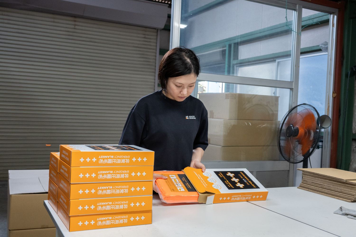 次の節目が11年3月に発生した東日本大震災をきっかけに、真空技術で収納しやすい非常用の毛布を作ったこと。交通機関がストップし事務所で夜を明かしたとい.う東京の問屋から懇願されました。タオルと毛布では伸縮性や弾力性が異なるため、ほぼ一からの開発となりましたが、同年12月には発売にこぎ着けました。これを機に圧縮毛布の量産態勢に入り、13年にはA4サイズに縮小。全国の自治体から注文が増えました。「200㎝ ×120㎝ の毛布を48回折り、厚さ3.5㎝ まで圧縮します。